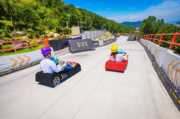 유월드루지테마파크유월드 루지는 도심 속 초대형 1.3km의 트랙을 특수 제작된 무동력 카트를 타고 경사면을 따라 조성된 터널, 어트랙션 구간, 스카이브리지 활강구간, 자연숲구간 등 다양하고 박진감 넘치는 트랙을 중력만을 이용해 내려오는 체험활동으로 남녀노소 누구나 스릴을 즐길 수 있다.